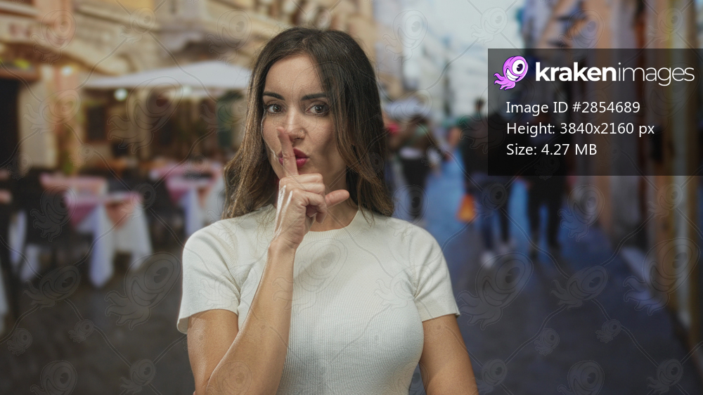 Woman finger to lips for silence on narrow street with blurred pedestrians under warm sunlight; privacy secrecy.