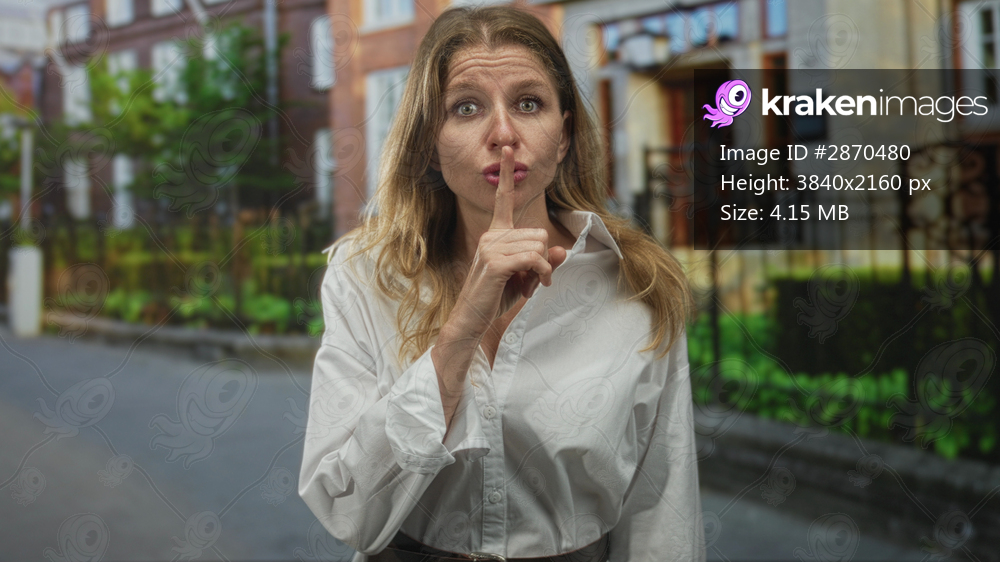 Woman finger to lips for silence on street in front of brick building and iron fence, wearing white shirt with visible hand gesture and neutral expression; quiet. - Kraken Images