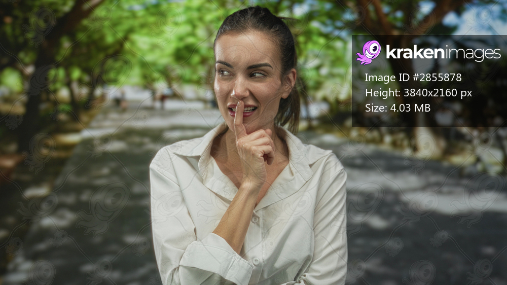 Woman finger to lips for silence on sunny street lined with green trees and scattered shadows; silence.