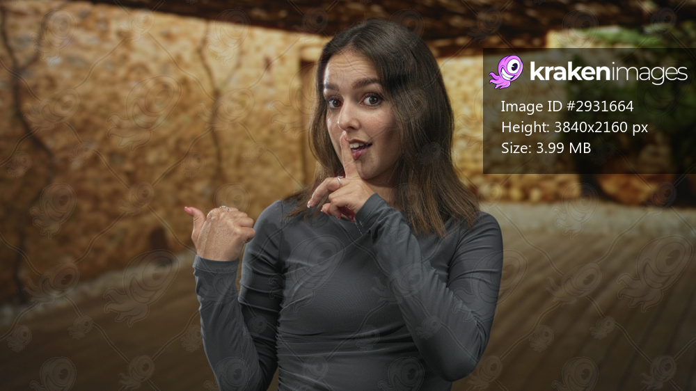 Woman with finger to lips for silence and thumb pointing back in a studio setting with visible ring on finger; playful secret.