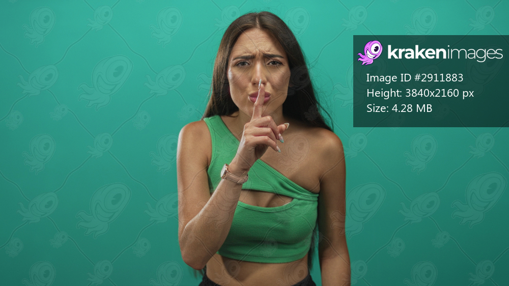 Woman finger to lips gesture in studio with teal backdrop and green crop top; silence secrecy caution.