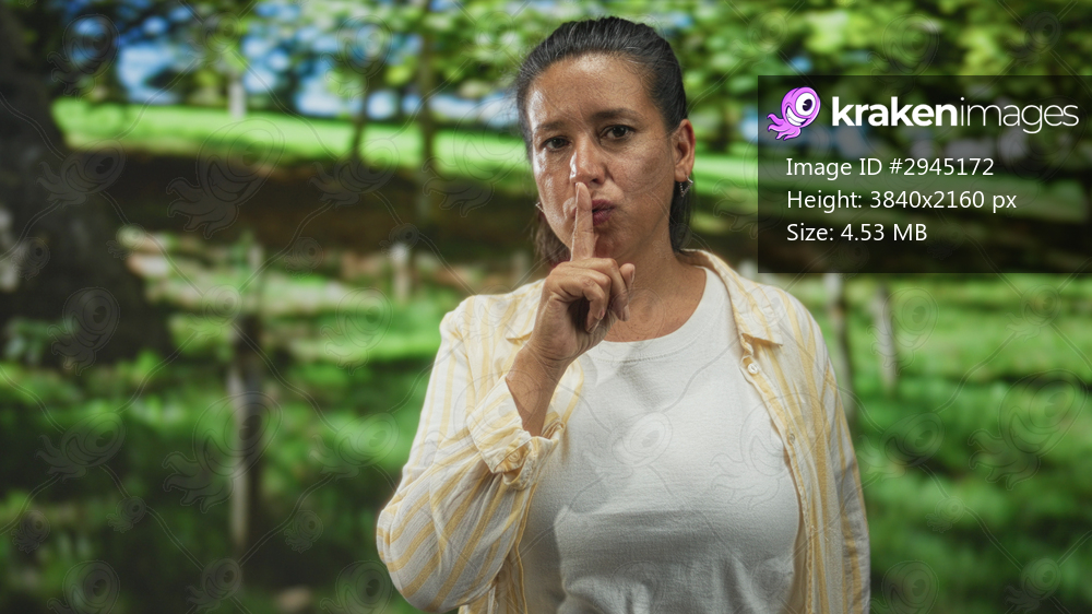Woman with finger to lips making a shushing gesture, wearing white tee and yellow striped shirt in a sunlit forest with wooden fence; silence serious.