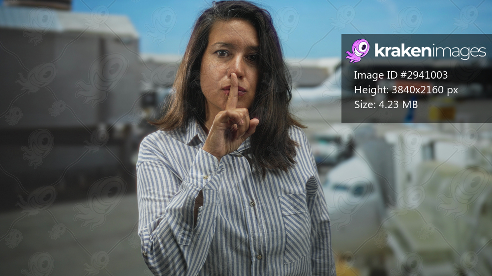Woman finger to lips shushing beside jet and jetway at airport, alternating silence and pointing gestures while facing camera; quiet secrecy.