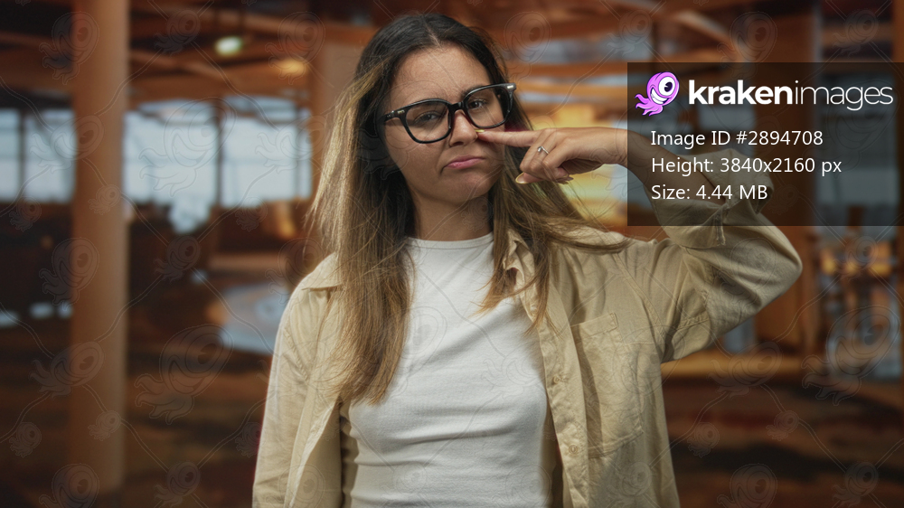 Woman finger to nose in restaurant wearing glasses and beige shirt, eyes closed and slight smile; playful confidence.