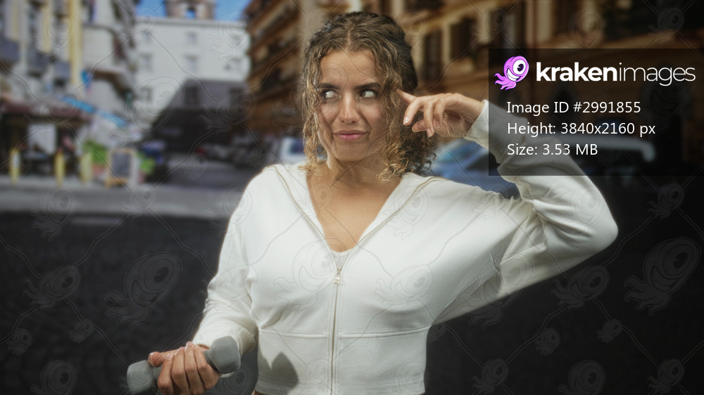 Woman with finger to temple holding dumbbell on a cobbled street near buildings and parked van; serenity focus.