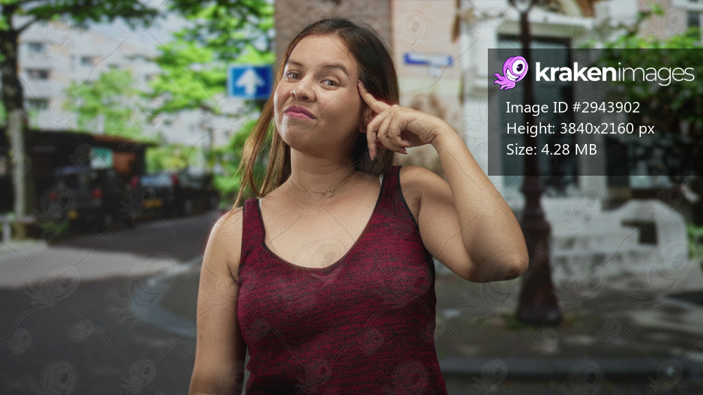 Woman finger to temple on city street wearing maroon tank top with bare shoulder and heart necklace, subtle smirk and natural stance; pensive.