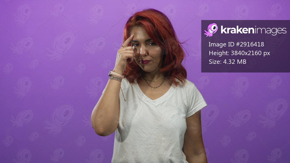 Woman with finger to temple and pointing finger gesture in purple studio; confidence focus assertiveness.