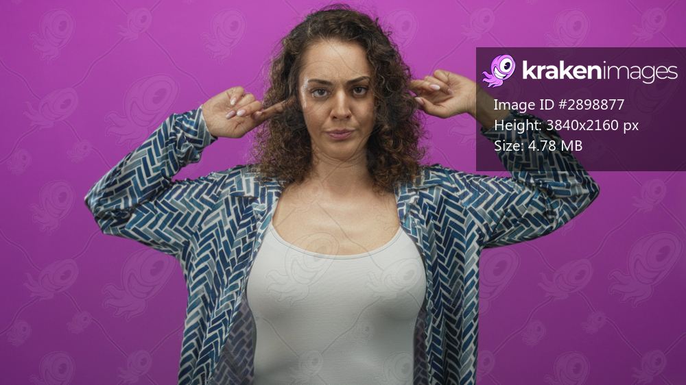 Woman with fingers to ears and exposed breasts in studio against purple wall; annoyance personal boundary assertiveness.