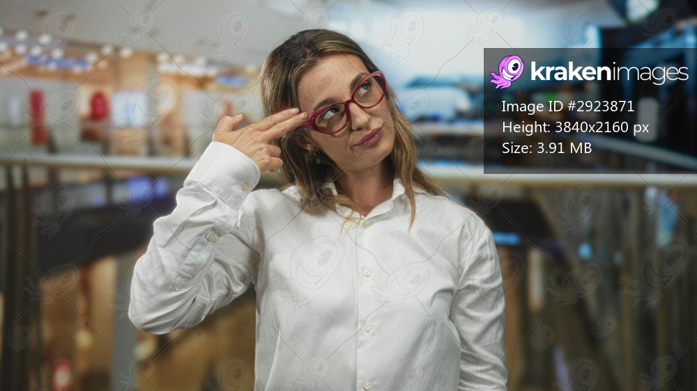 Woman with fingers to temple and raised hand gesture inside a shopping building, wearing white shirt and red glasses; sarcasm.