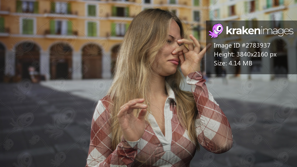Woman firmly pinches nose with fingers in crowded urban plaza under sunlight; disgust distaste rejection aversion.