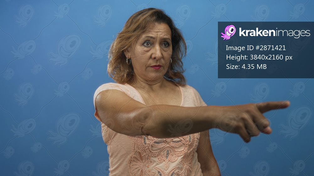 Woman firmly points with right index finger forward with focused gaze in blue studio environment; confidence.