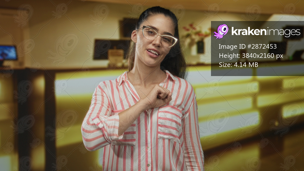 Woman with fist to chest gesture at hotel reception desk inside a building, wearing pink striped shirt and glasses; solidarity.
