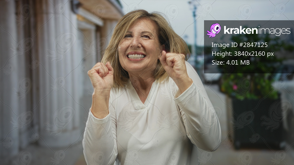 Woman fists clenched hands raised high on city street with building facade behind; victory triumph joy energy.