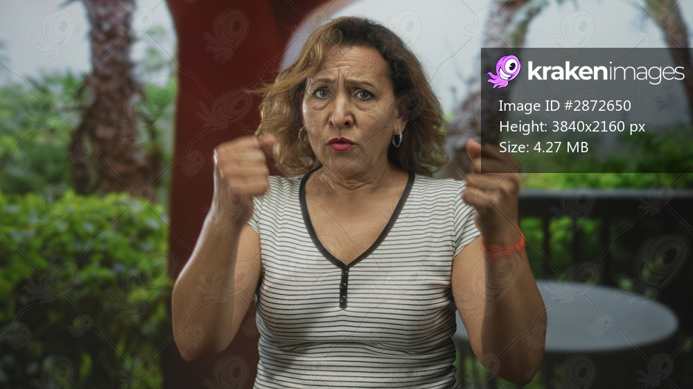 Woman fists clenched and raised in building terrace by green plants overlooking patio table; stress.