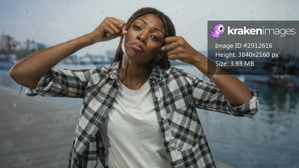 Woman with fists raised and braided hair dancing on a port pier near moored boats, clenched hands and expressive face; playful confidence.