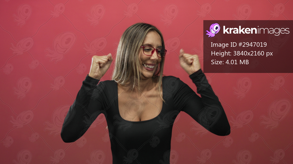 Woman with fists raised in studio against a red pink backdrop, wearing red glasses, smiling while celebrating; joy celebration.