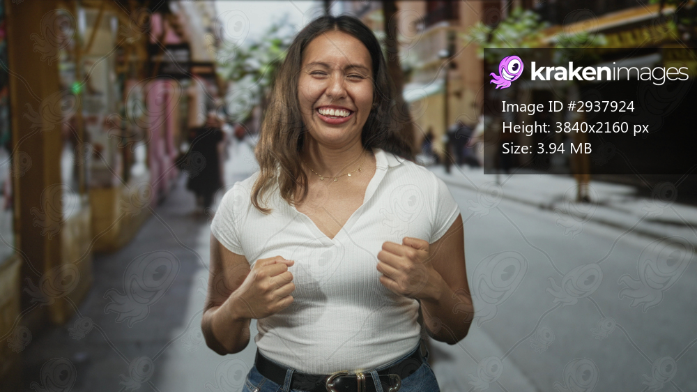 Woman with fists raised on a busy city street, smiling with closed eyes; joy celebration resilience.