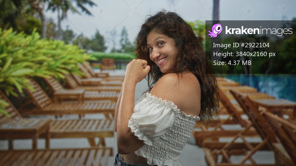 Woman with fists raised, smiling, bare shoulders and midriff visible, wearing white off shoulder top and denim jeans at resort; playful strength.