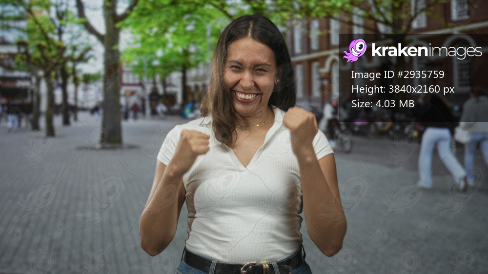 Woman with fists raised smiling broadly on city street in daytime; joy celebration success confidence.