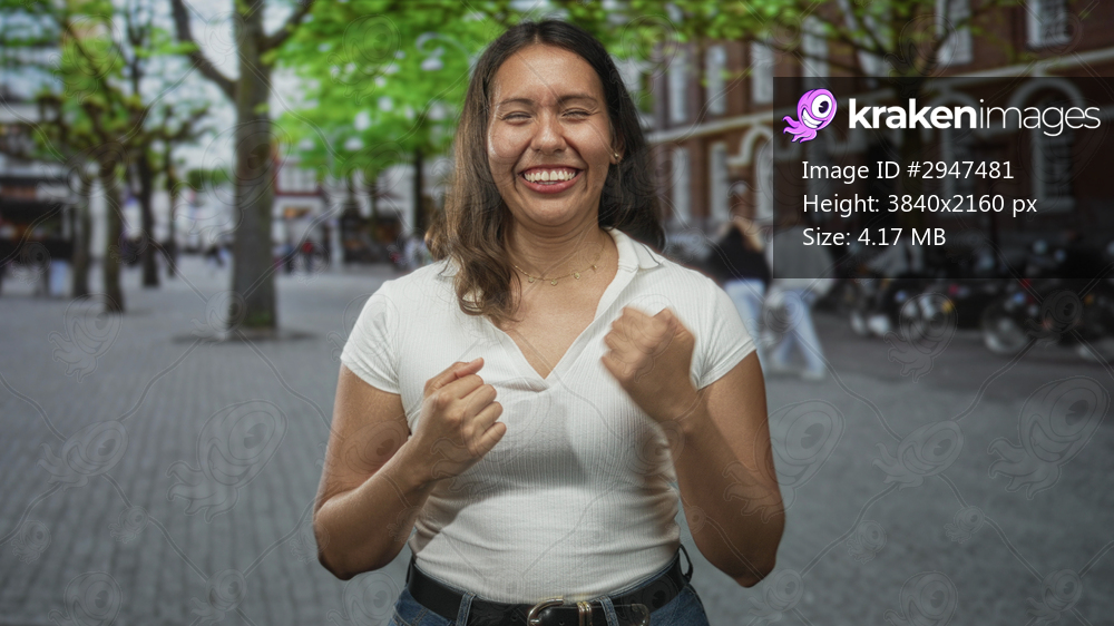 Woman with fists raised smiling broadly on city street in daytime; joy celebration success confidence.