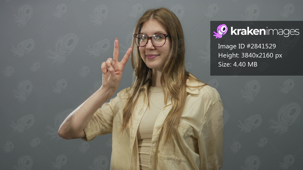 Woman flashing peace sign with two fingers near face in studio setting with grey backdrop; serenity.