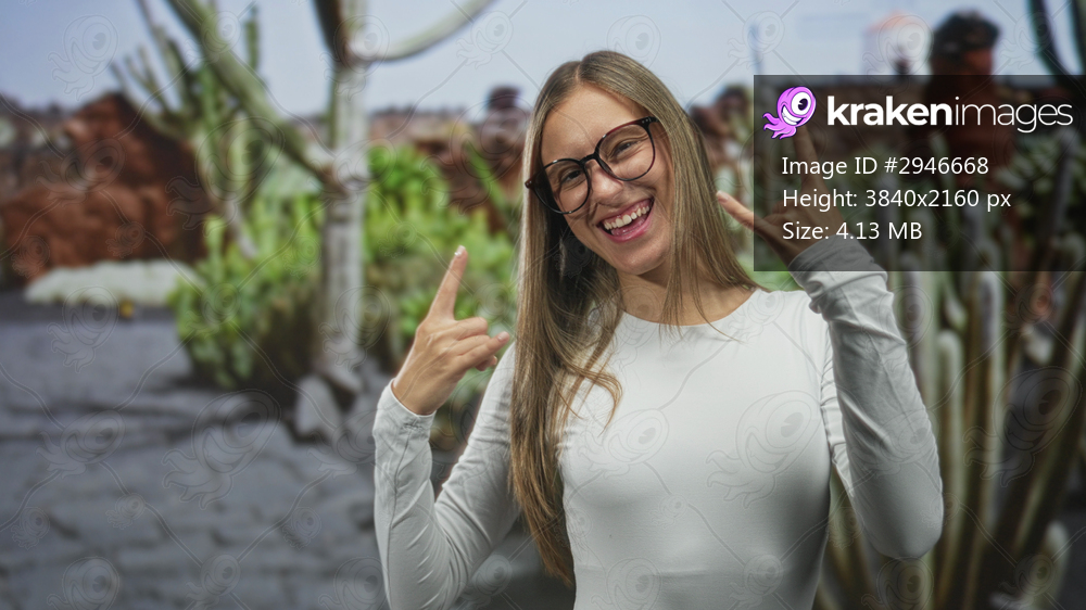 Woman flashing rock horns and smiling while pointing at her face in a studio with cactus mural and blurred props; playful confidence.