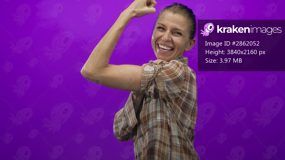 Woman flexes arm and bares bicep with fist raised and rolled sleeves against vibrant purple studio wall; confidence empowerment.