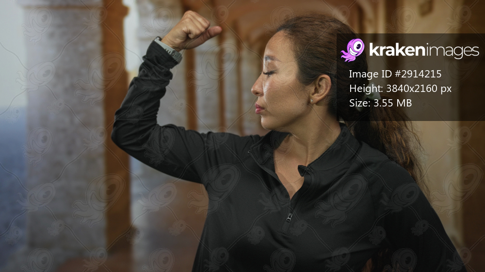 Woman flexes arm with clenched fist in building corridor, wearing black zip jacket and ponytail; strength determination.