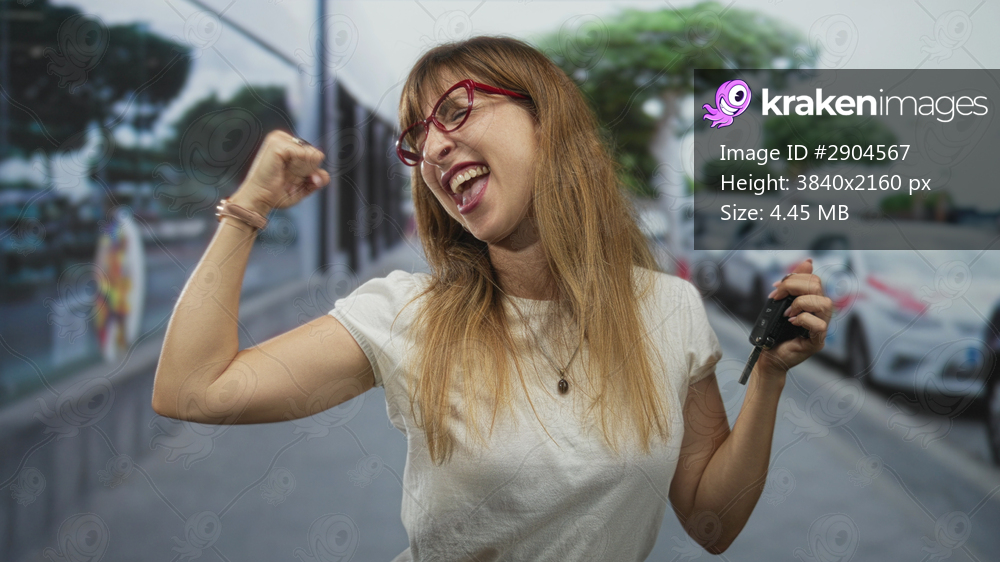 Woman flexes arm and clenches fist while holding car keys on a street with parked cars; confidence victory.