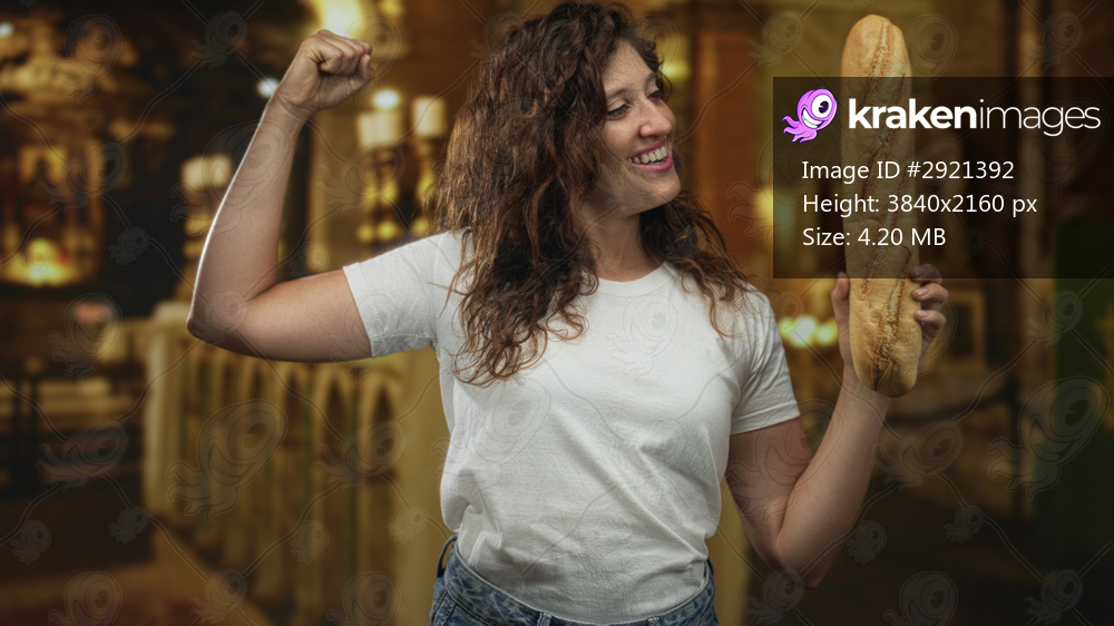 Woman flexes arm and holds baguette in a church building while smiling and facing camera; pride strength.