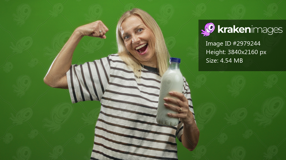 Woman flexes arm and holds milk bottle in studio green backdrop, smiling with raised fist and open mouth in playful victory; confidence energy.