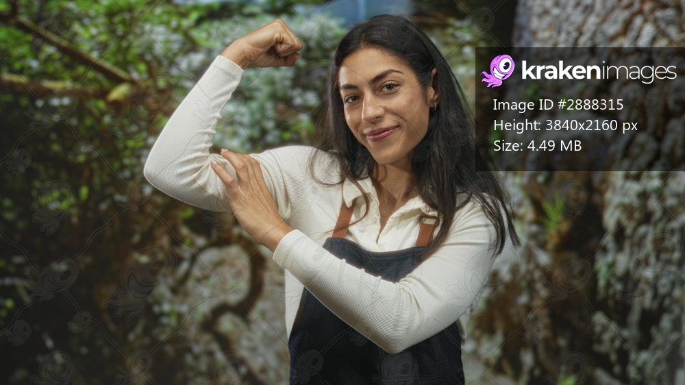 Woman flexes arm in forest park wearing apron and white top, smiling while showing strength; confidence.