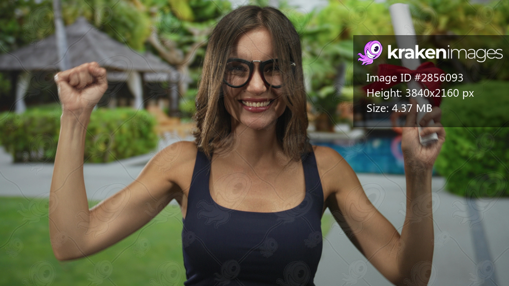 Woman flexes arm muscles, smiles broadly and holds diploma by hotel building; achievement success pride.