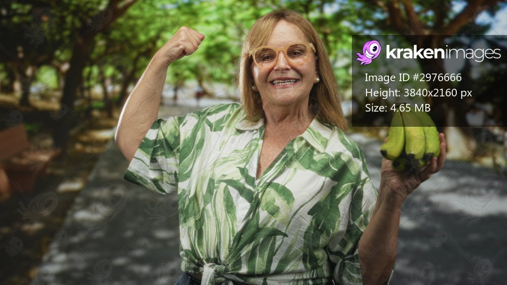 Woman flexes arm showing biceps and holds ripe bananas in her right hand on a tree lined street beside park benches; confidence empowerment.
