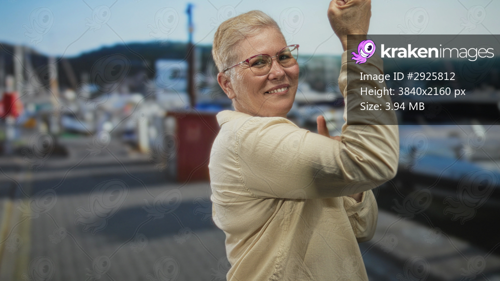 Woman flexes arm and smiles at camera on a harbor quay street by moored boats, wearing glasses and light shirt, visible forearm skin and raised fist gesture; confidence. - Kraken Images