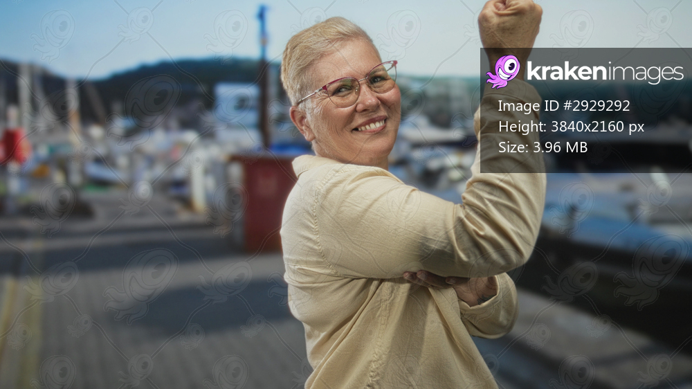 Woman flexes arm and smiles at camera on a harbor quay street by moored boats, wearing glasses and light shirt, visible forearm skin and raised fist gesture; confidence. - Kraken Images