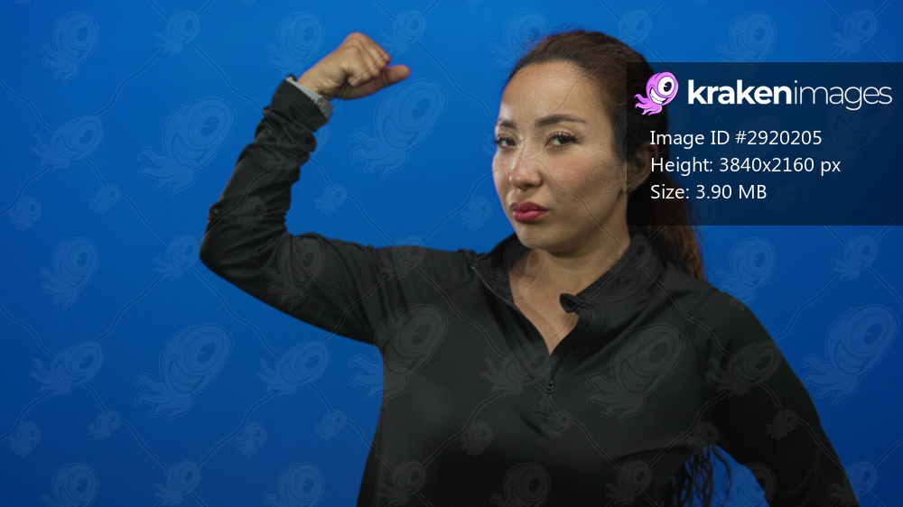 Woman flexes arm and tenses fist in blue studio while wearing black athletic pullover and ponytail; confidence empowerment strength.