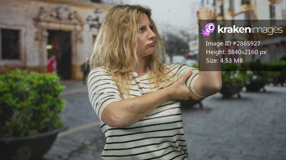 Woman flexes arm while holding her upper arm on a cobblestone street lined with planters and historic buildings; empowerment.