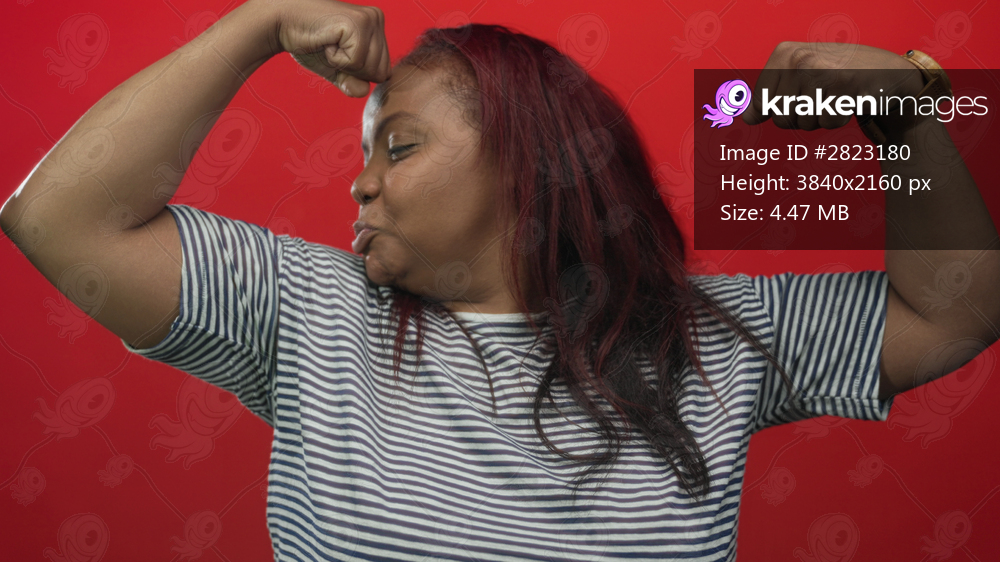 Woman flexes arms and clenches fists while scrunching face in studio against red backdrop; empowerment confidence resilience.
