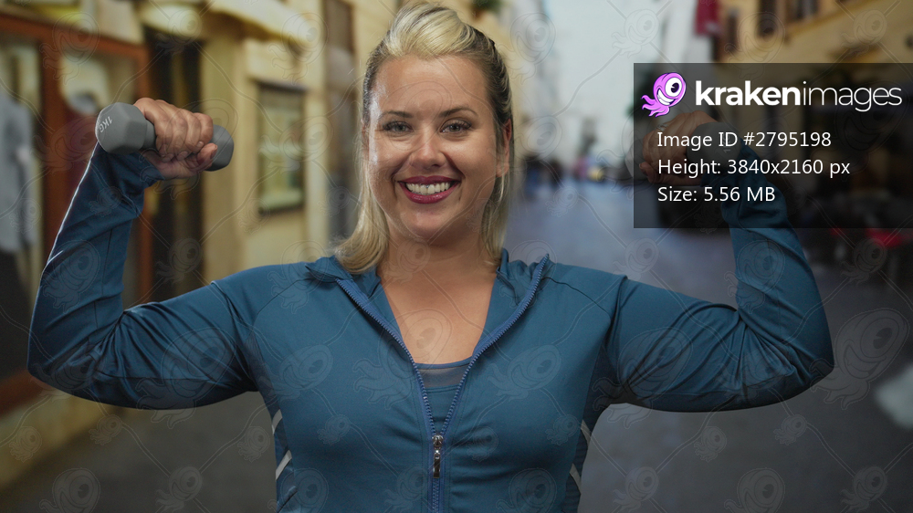 Woman flexes arms holding 1kg gray dumbbells while smiling in a blue zippered jacket on a city street; confidence.