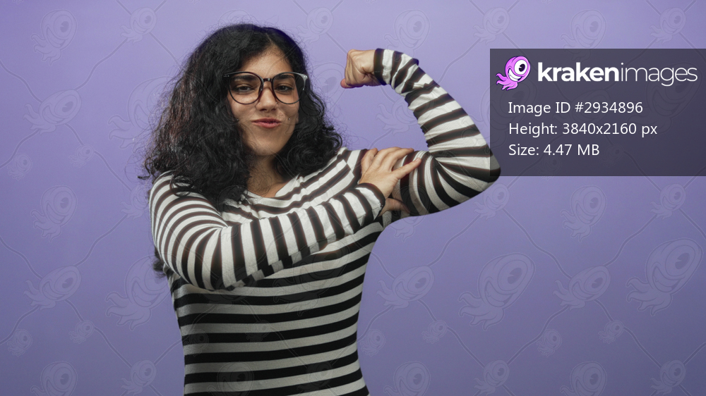 Woman flexes arms and smiles in studio in front of a purple wall while wearing glasses and a striped top; confidence strength.