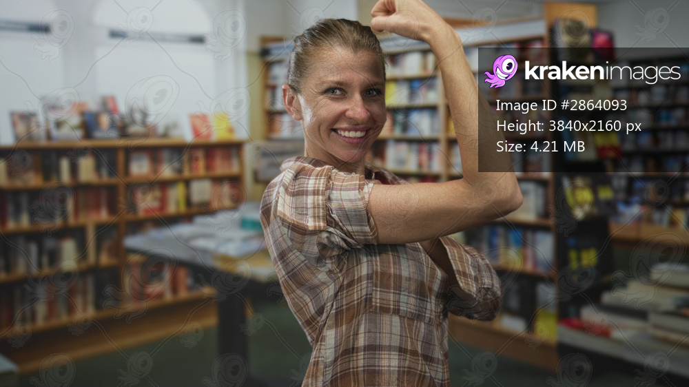 Woman flexes bare arm and smiles in library building, showing bicep and rolled sleeve while standing near bookshelves; confidence.