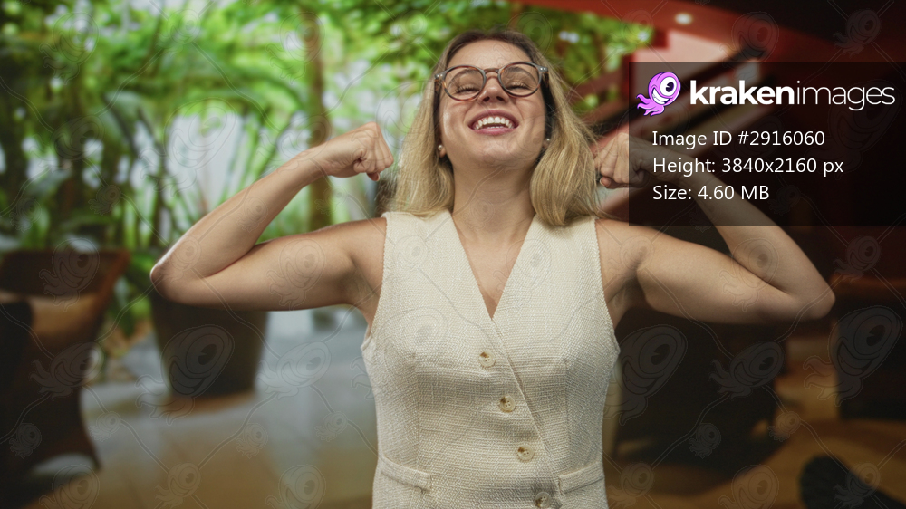 Woman flexes bare arms and smiles in a hotel building while wearing a sleeveless vest and glasses; confidence celebration.