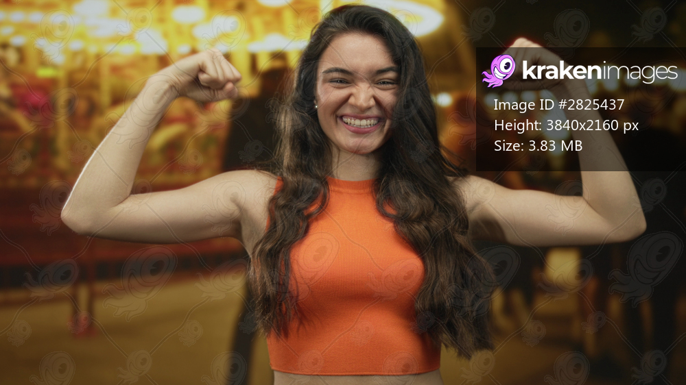 Woman flexes bare arms and smiles under colorful lights at nighttime fair in an orange top; confidence.