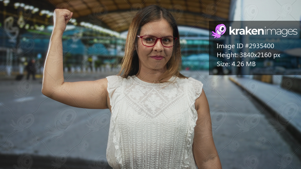Woman flexes bicep at airport terminal while looking sideways, wearing red glasses and white blouse; confidence empowerment resilience.