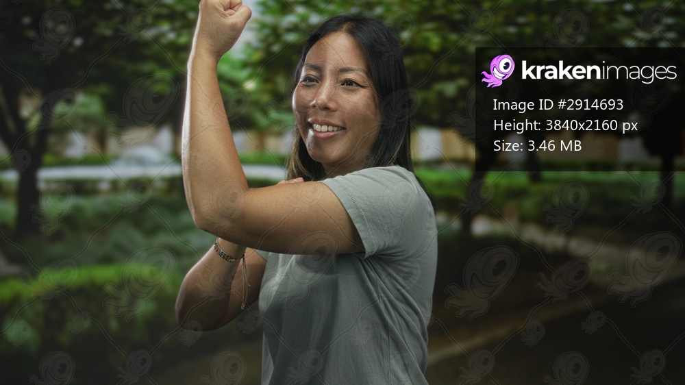 Woman flexes bicep in park pathway showing bare arm and bracelet while smiling at camera amid lush green trees and hedge; confidence strength empowerment. - Kraken Images