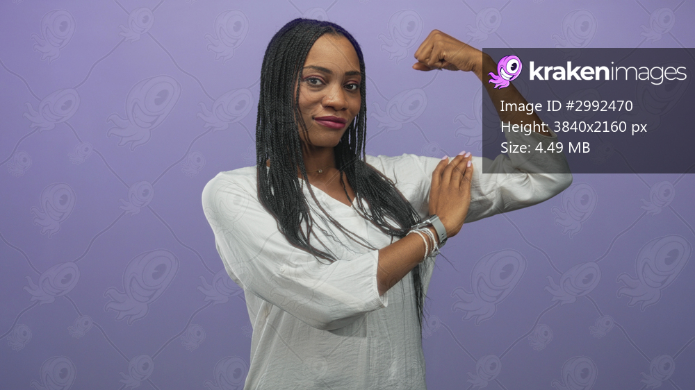 Woman flexes bicep with left hand supporting the arm, wearing white blouse in studio; empowerment confidence.