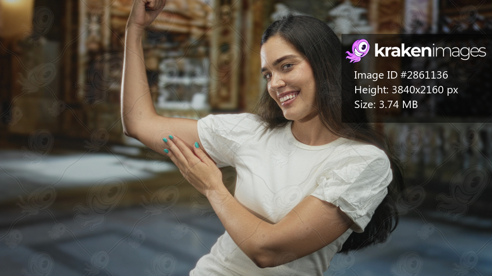 Woman flexes bicep muscle in ornate catholic church interior and points finger to upper arm display; empowerment confidence.