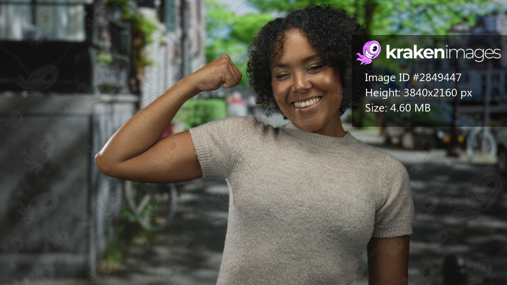 Woman flexes bicep on street sidewalk in front of parked bicycle and car under leafy trees; empowerment confidence.