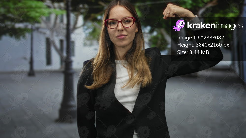 Woman flexes bicep on urban street plaza wearing red glasses and black blazer, arm raised in strength gesture; confidence empowerment success.